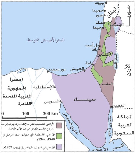 تحت ضغط الولايات المتحدة الأمريكية اعترفت منظمة الأمم المتحدة بدولة إسرائيل وأصدرت في 29 نونبر 1947 قرارا بتقسيم فلسطين بين العرب واليهود، وبعد انتهاء فترة الانتداب البريطاني في 14 ماي 1948 تم إعلان قيام دولة إسرائيل، فصادرت الأراضي العربية بعد طرد الفلسطينيين، مما أدى إلى نشوب حربين بين الدول العربية وإسرائيل سنتي 1948 و 1967 انتهتا بانهزام العرب وتوسيع المستوطنات اليهودية حتى شملت كل أراضي فلسطين وصحراء سيناء وهضبة الجولان السورية، إضافة إلى حرب الكرامة في أكتوبر 1973 التي لم يسترجع العرب خلالها أي أرض محتلة، فاضطرت مصر إلى توقيع اتفاقية كامب ديفيد سنة 1978 مع إسرائيل مقابل استعادة أرض سيناء.