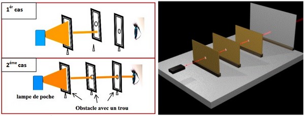 On dispose de trois plaques de carton percées d'un trou et d'une lampe de poche allumée.
