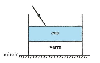 Un pinceau de lumière monochromatique est dirigé vers la surface d’une eau contenue dans un récipient en verre à fond épais et qui est posé sur un miroir plan.