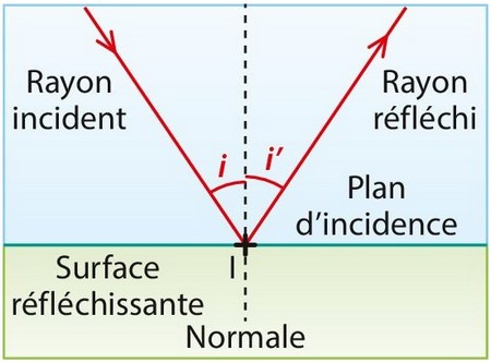 Les angles d’incidence i et de réflexion i' sont égaux.