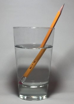 On immerge partiellement un crayon dans un verre plein d'eau.