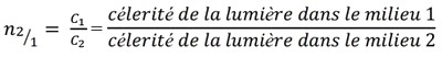 On définit l'indice relatif de réfraction d'un milieu par rapport à un autre par la relation :