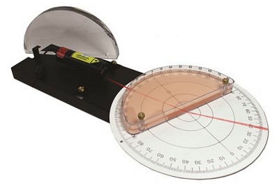 On utilise un demi disque en verre que l’on place sur le disque gradué et on envoie a l'aide d'une source laser un pinceau lumineux comme l'indique la figure suivante :