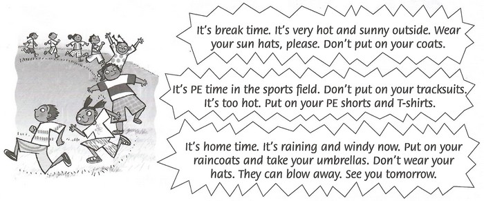 Listen and read. Look at the pictures. What is the weather like?