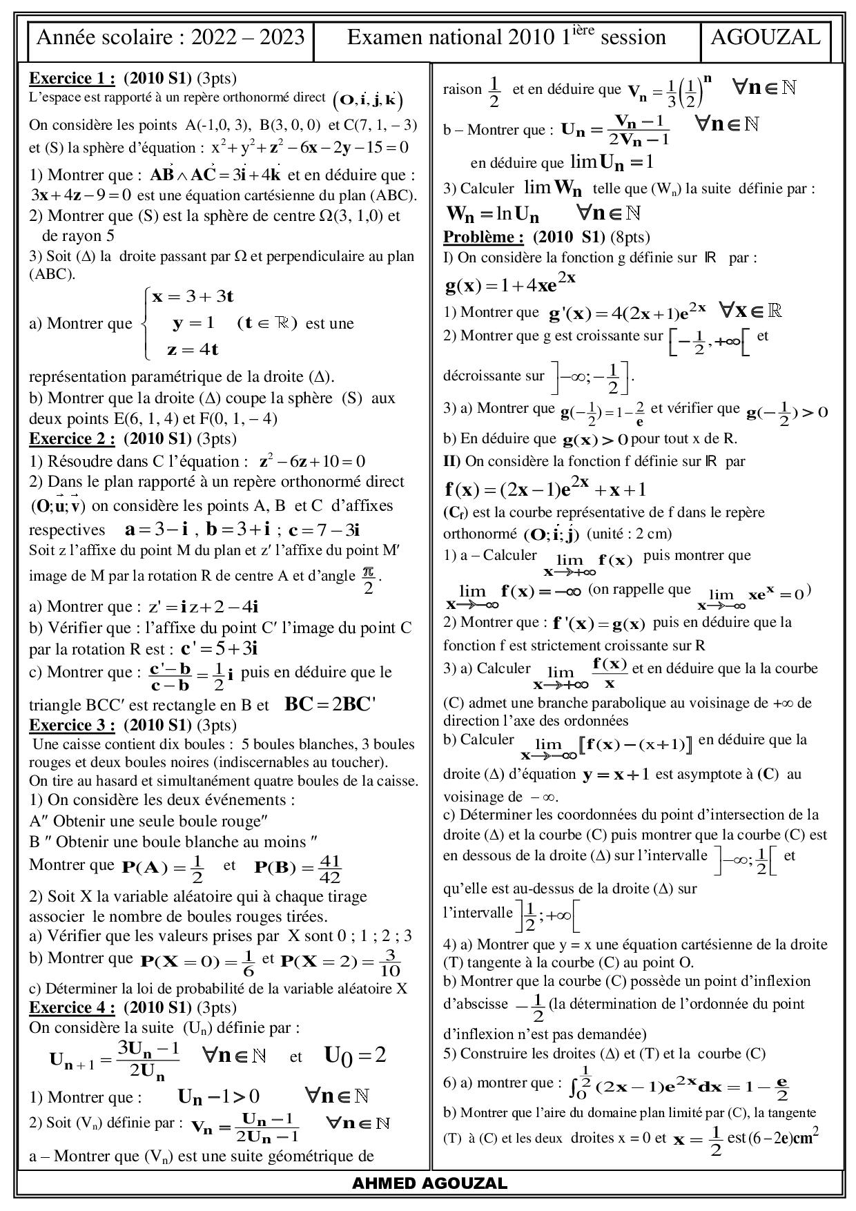 Examen National Maths Sciences et Technologies 2010 Normale - Sujet