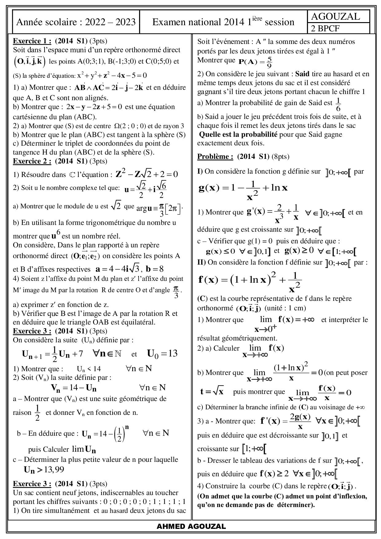 Examen National Maths Sciences et Technologies 2014 Normale - Sujet
