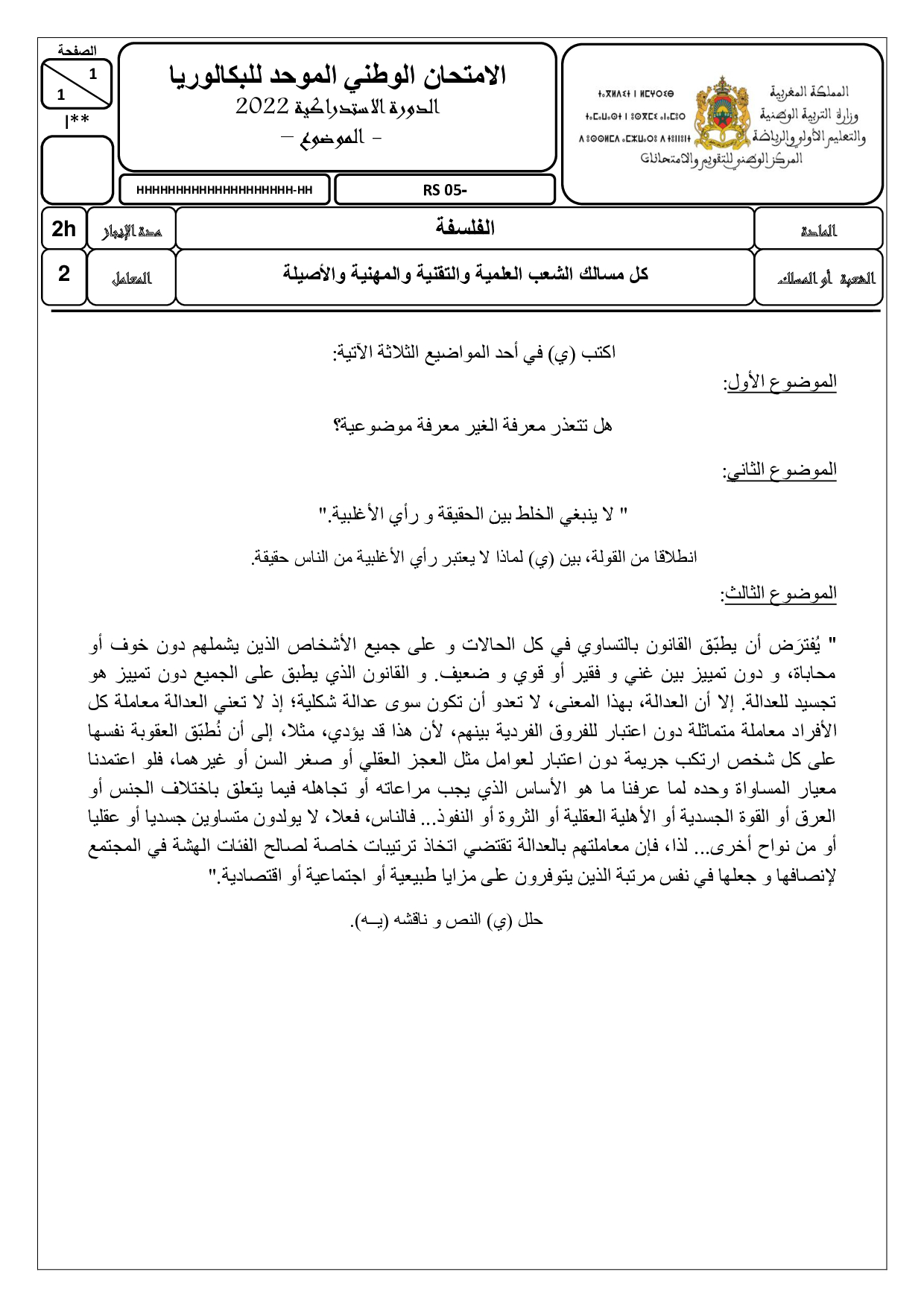 الفلسفة للشعب العلمية والتقنية 2022 الدورة الإستدراكية - الموضوع