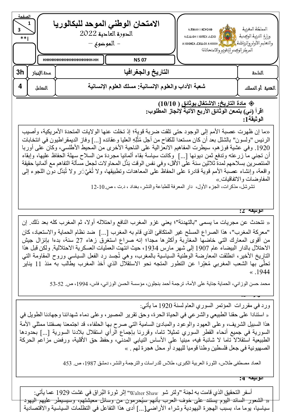 الإجتماعيات (شعبة العلوم الإنسانية) 2022 الدورة العادية - الموضوع