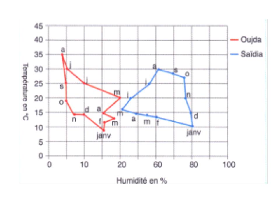 - la moyenne de température maximale du mois le plus chaud et la quantité des précipitations mensuelles.