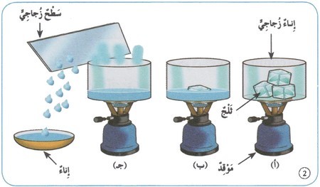 1- أضع قطع الثلج في إناء، ثم أضع الإناء فوق موقد.