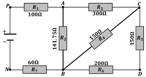 On considère le circuit électrique qui contient sept conducteurs ohmiques et un générateur de tension continue :