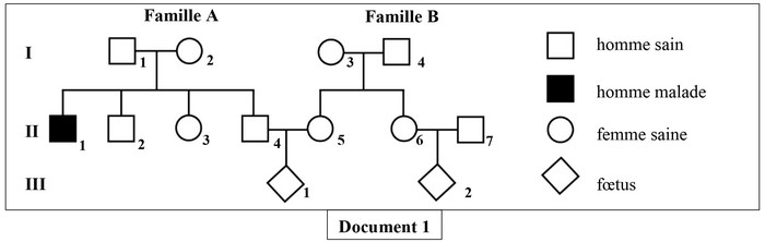 Le document 1 présente l’arbre généalogique de deux familles A et B dont l’un des individus est atteint de cette maladie :