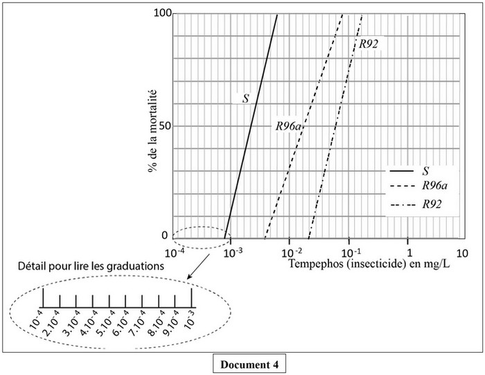 Pour établir la relation entre la répartition de cet allèle et l’action des insecticides, on présente les données du document 3 qui montre la variation de la fréquence de l’allèle en s’éloignant de la zone côtière traitée par les insecticides :