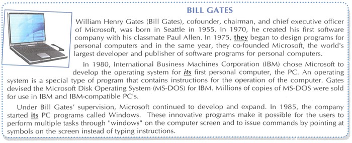 a. Bill Gates and Paul Allen created Microsoft. b. Bill Gates' year of birth. c. Bill Gates created Windows. d. Microsoft started working for IBM. e. Bill Gates and Paul Allen created their first company. |
