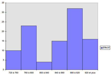 On peut encore simplifier la restitution des données, il suffit de créer des classes et de compter l’effectif de chaque classe. On partage alors l’étendue (plus grande valeur − plus petite valeur, ici des valeurs en intervalles :