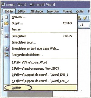 Pour quitter Word 2003, on peut utiliser la commande «Quitter » du menu «Fichier » :