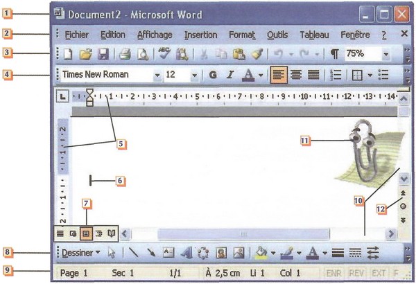 Le document suivant présente les principaux éléments constituant l'environnement de Microsoft Word :