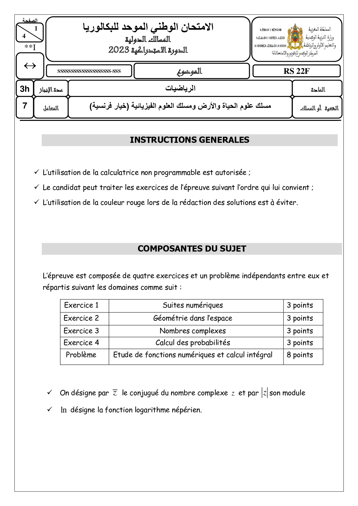 Examen National Maths Sciences et Technologies 2023 Rattrapage - Sujet