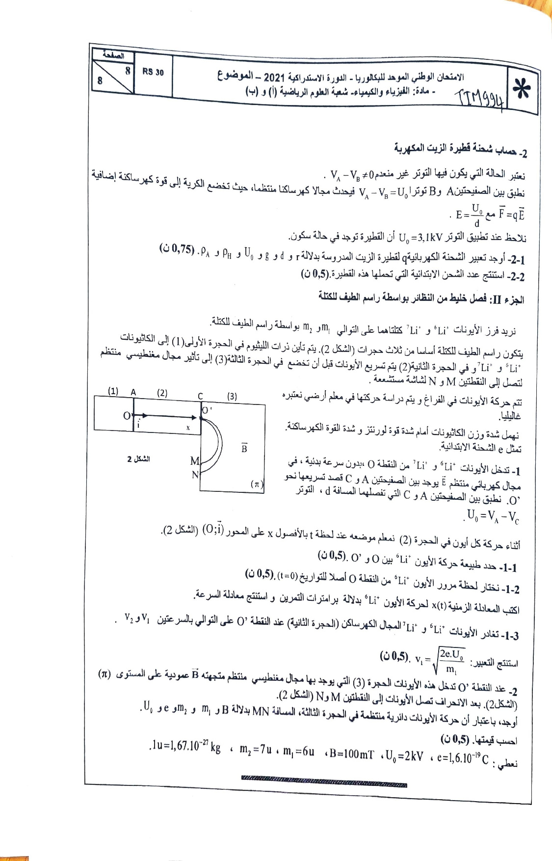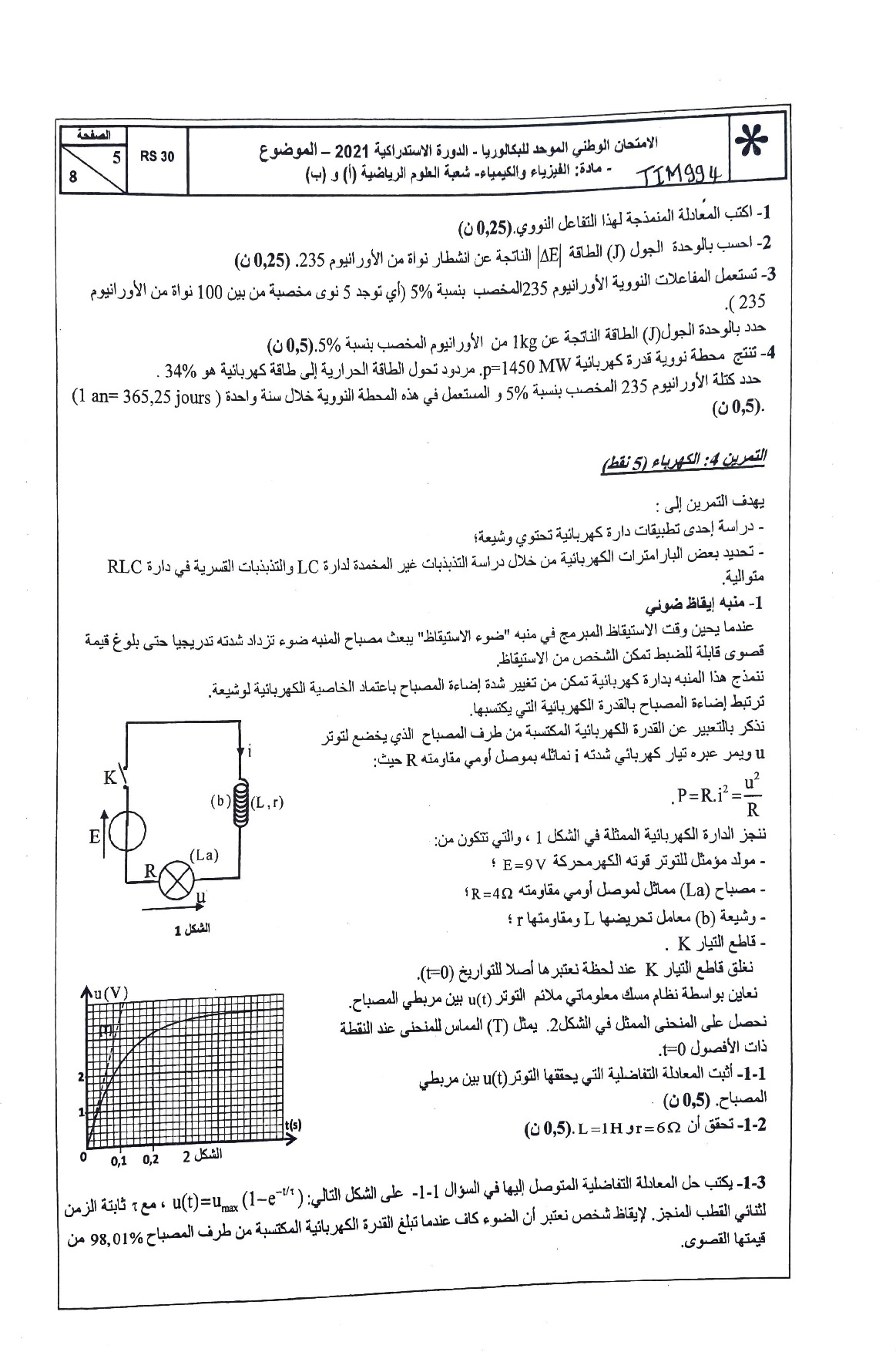الفيزياء والكيمياء علوم رياضية 2021 الدورة الإستدراكية - الموضوع