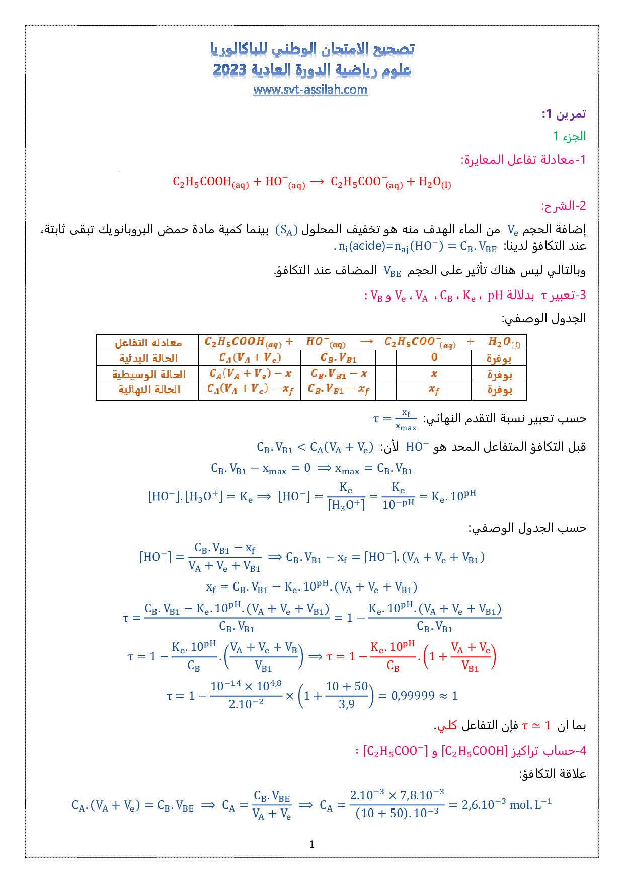الفيزياء والكيمياء علوم رياضية 2023 الدورة العادية - التصحيح
