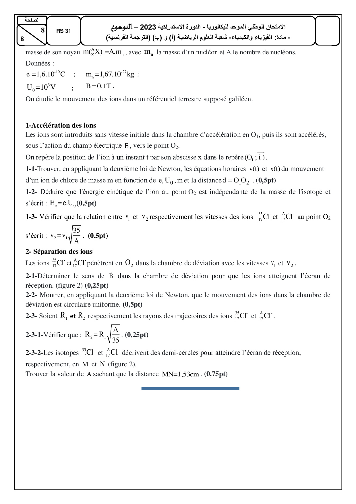 Examen National Physique-Chimie Sciences Maths 2023 Rattrapage - Sujet