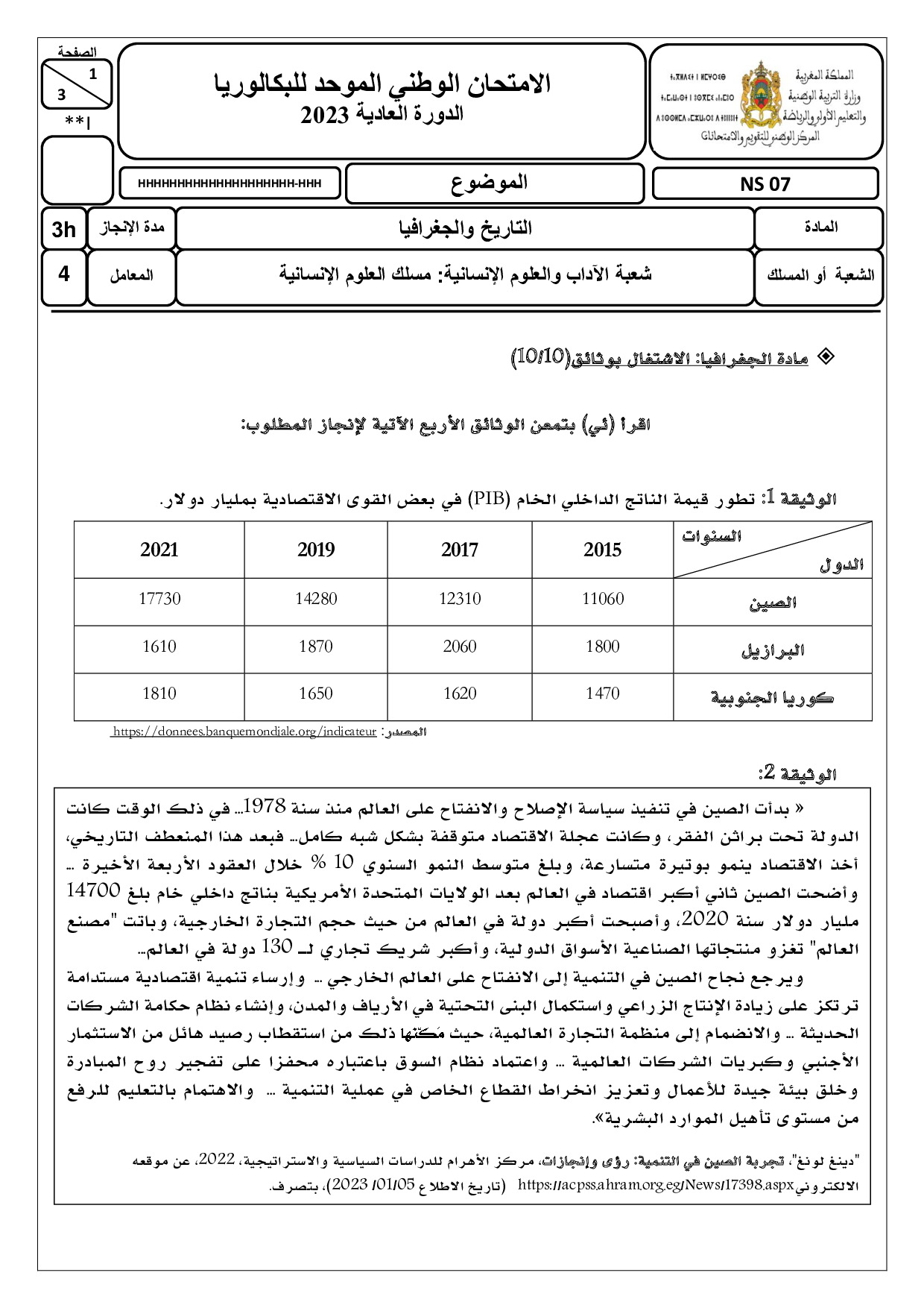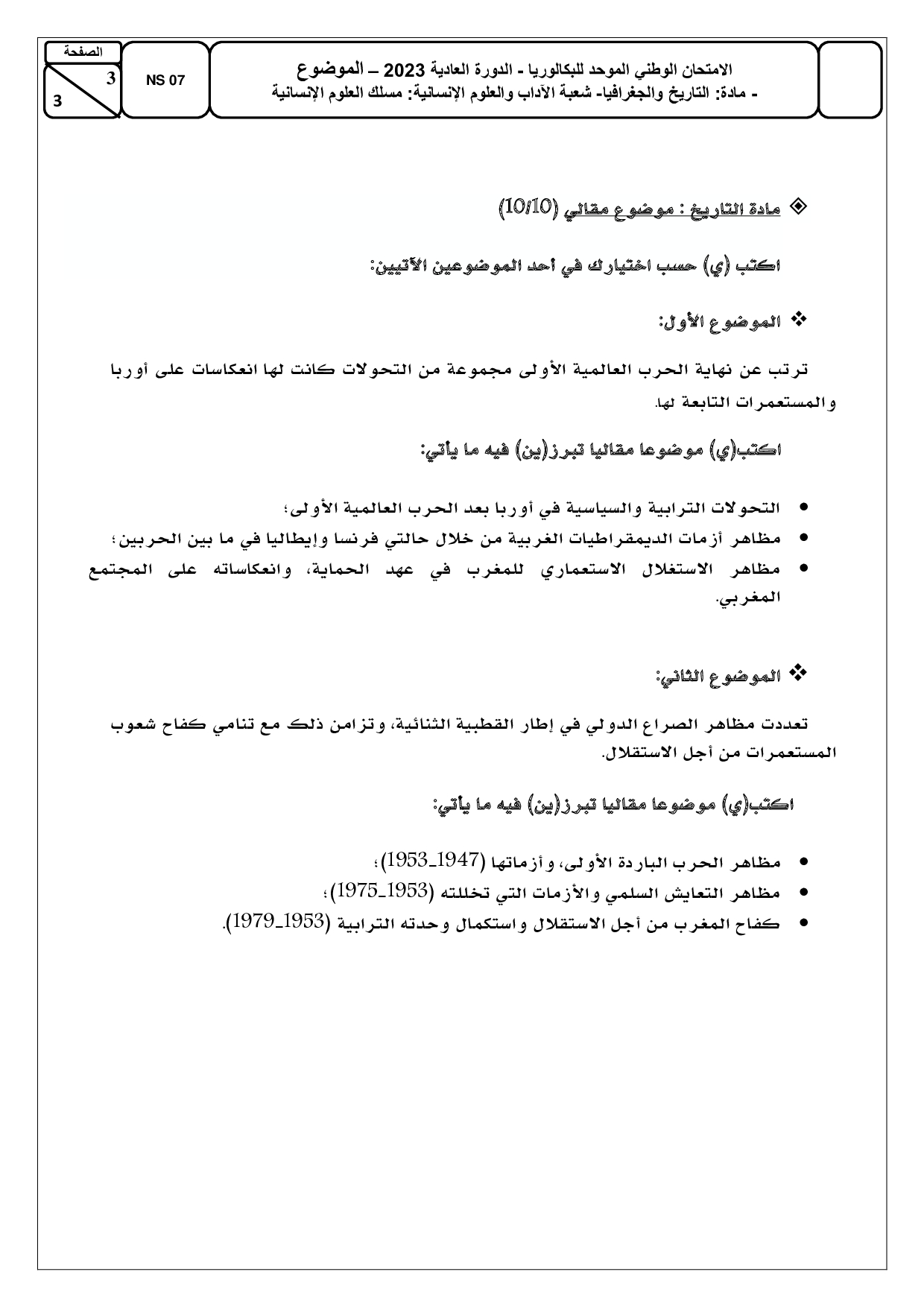 الإجتماعيات (شعبة العلوم الإنسانية) 2023 الدورة العادية - الموضوع