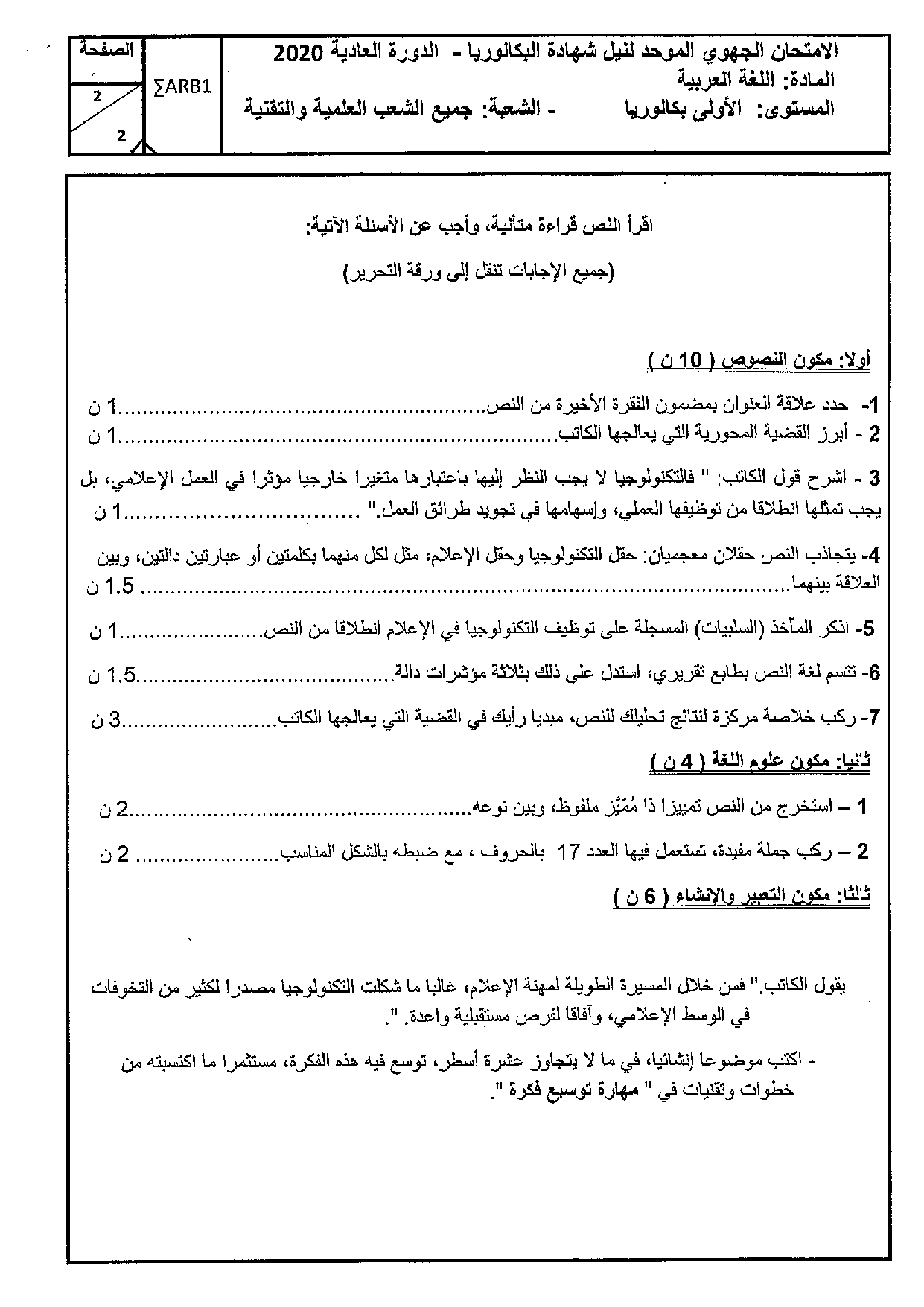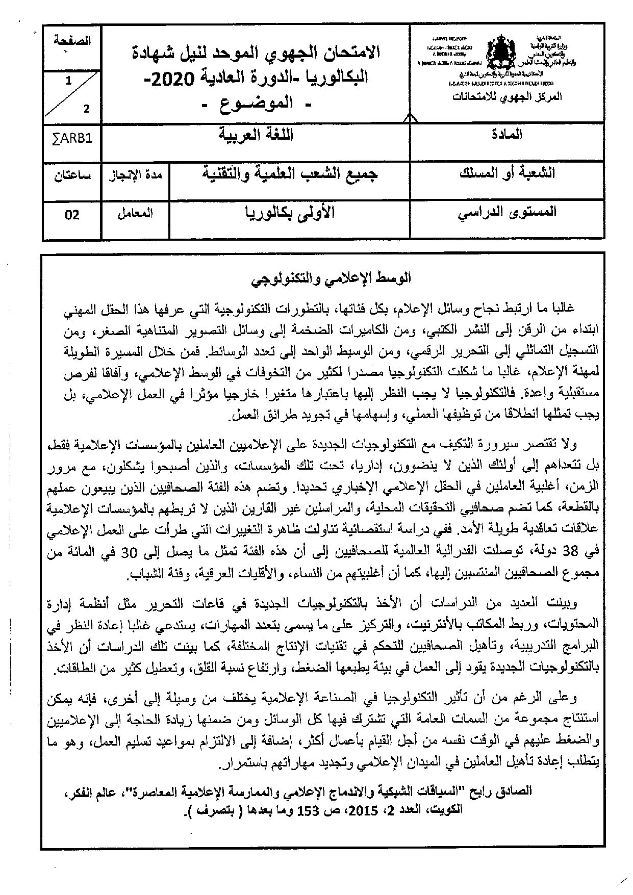 الامتحان الجهوي في اللغة العربية (د. العادية) - الشرق 2020 - الموضوع