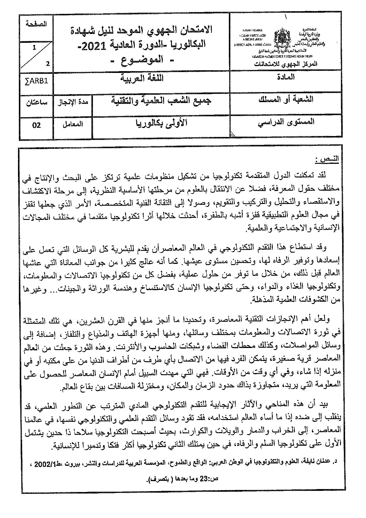الامتحان الجهوي في اللغة العربية (د. العادية) - الشرق 2021 - الموضوع