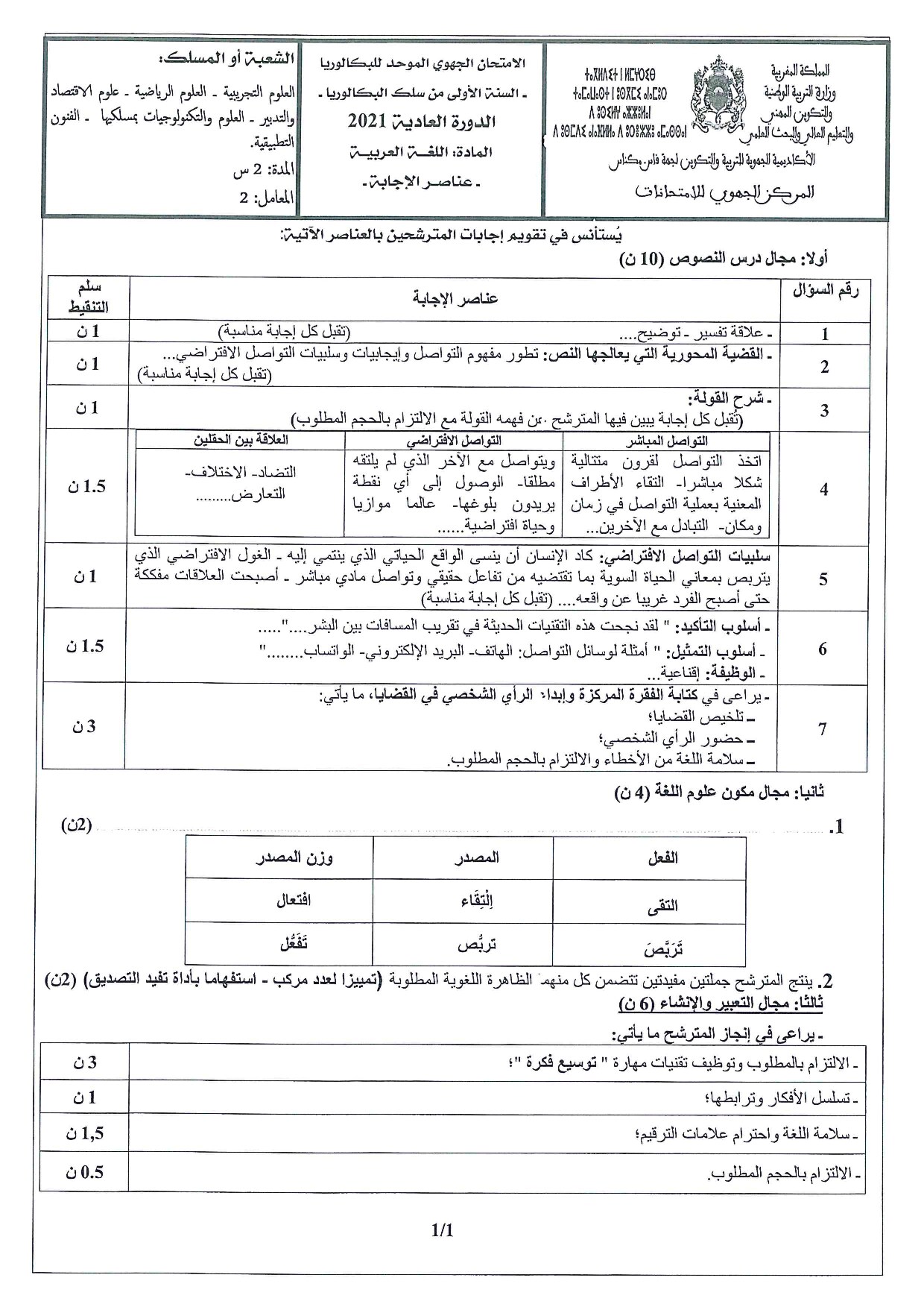 الامتحان الجهوي في اللغة العربية (د. العادية) - فاس مكناس 2021 - التصحيح