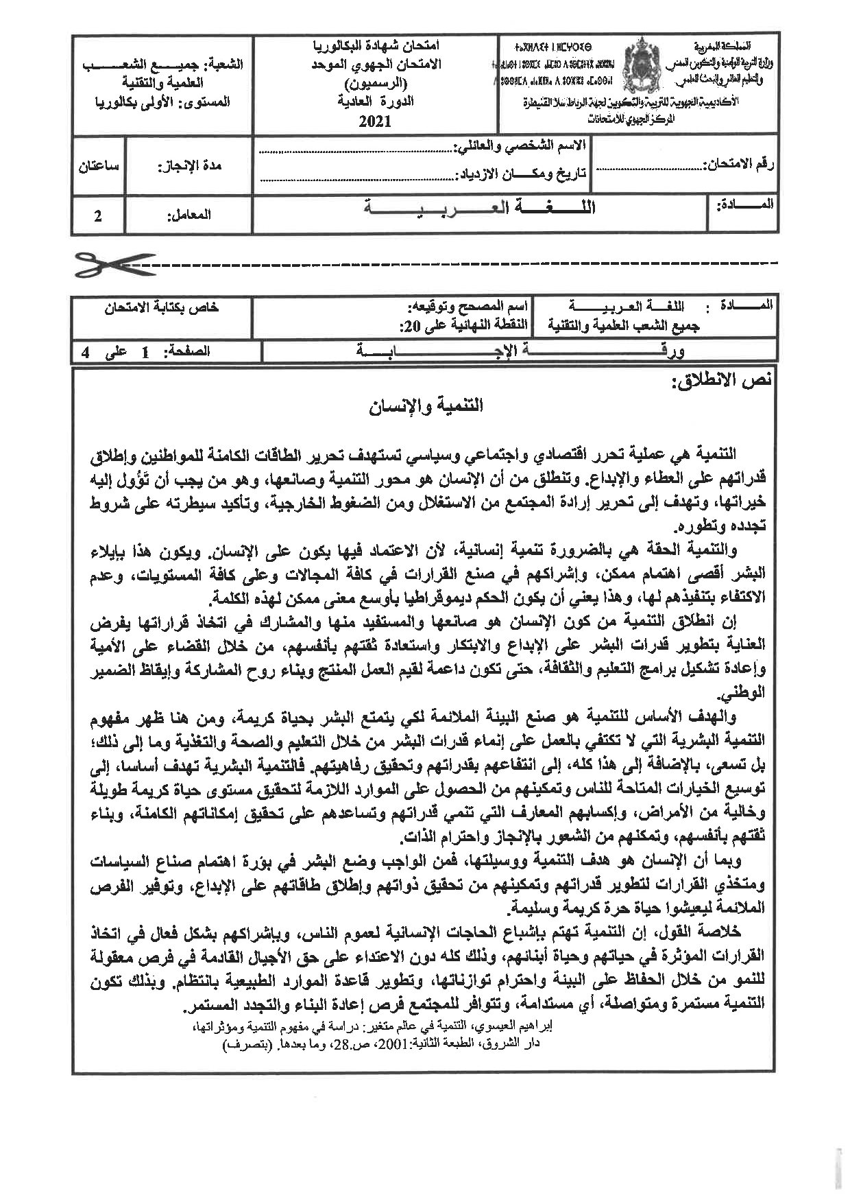 الامتحان الجهوي في اللغة العربية (د. العادية) - الرباط سلا القنيطرة 2021 - الموضوع