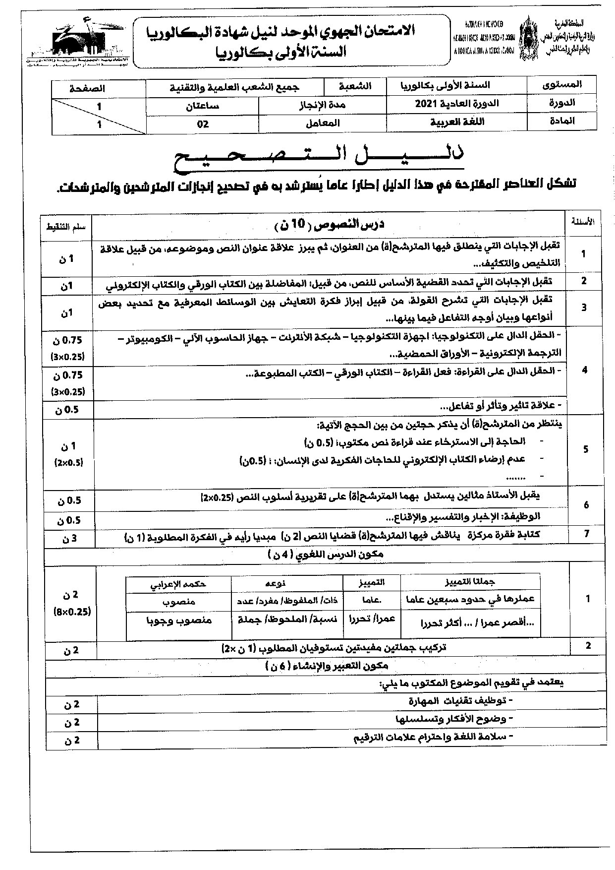 الامتحان الجهوي في اللغة العربية (د. العادية) - الدار البيضاء سطات 2021 - التصحيح