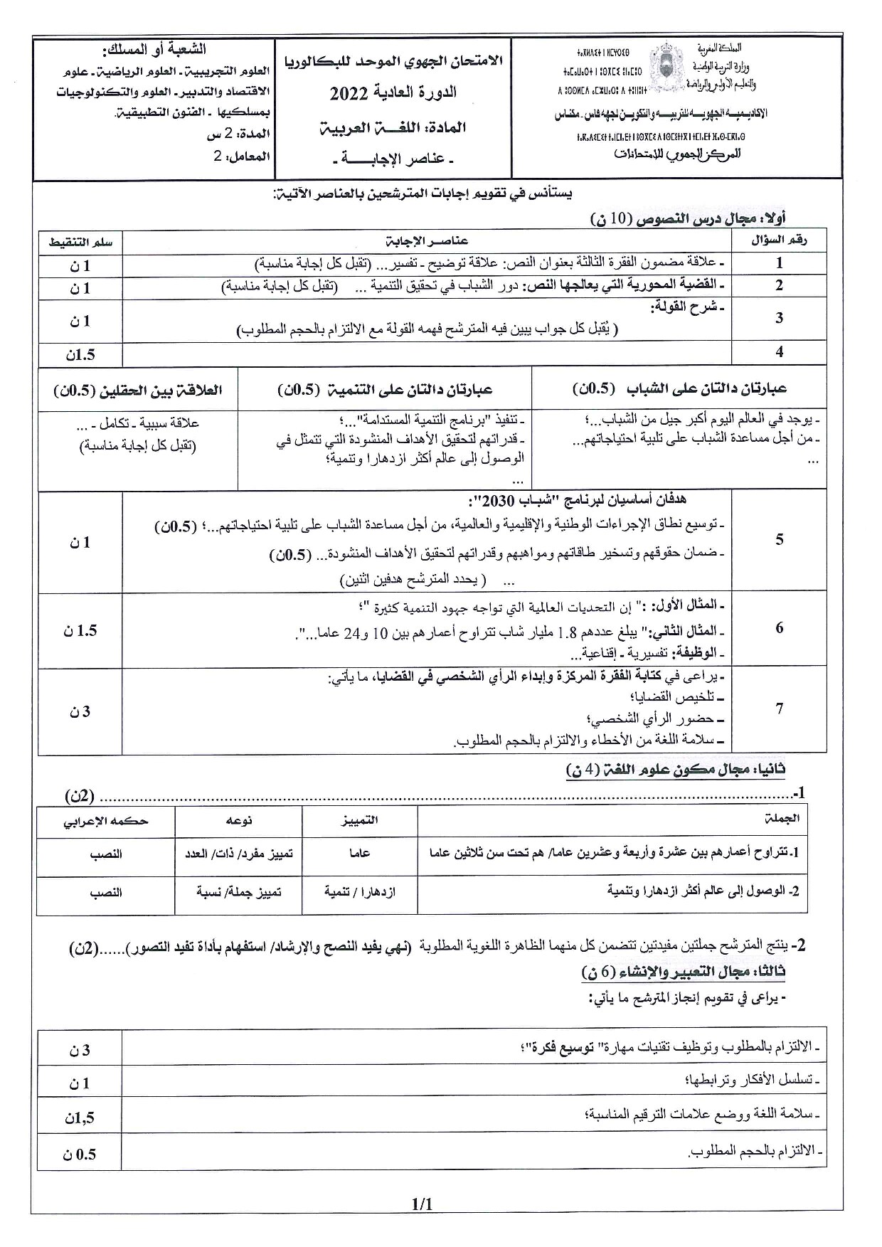 الامتحان الجهوي في اللغة العربية (د. العادية) - فاس مكناس 2022 - التصحيح