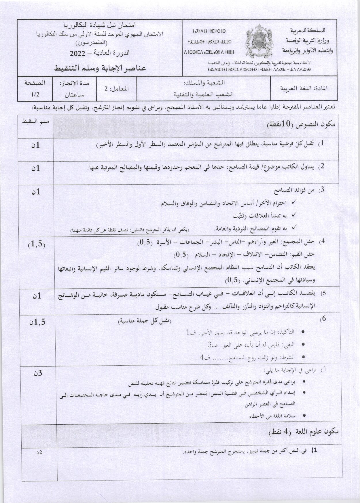 الامتحان الجهوي في اللغة العربية (د. العادية) - الداخلة وادي الذهب 2022 - التصحيح