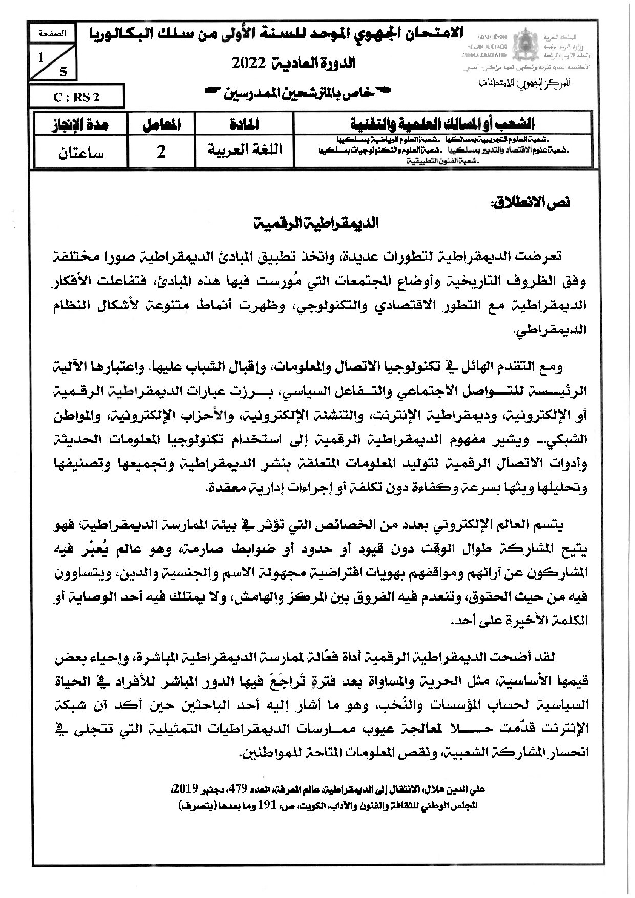 الامتحان الجهوي في اللغة العربية (د. العادية) - مراكش آسفي 2022 - الموضوع