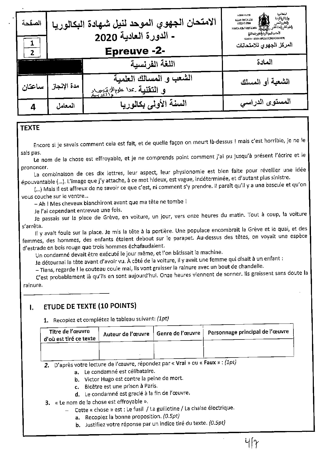Examen régional Français (Session Normale) - Orient 2020 - Sujet