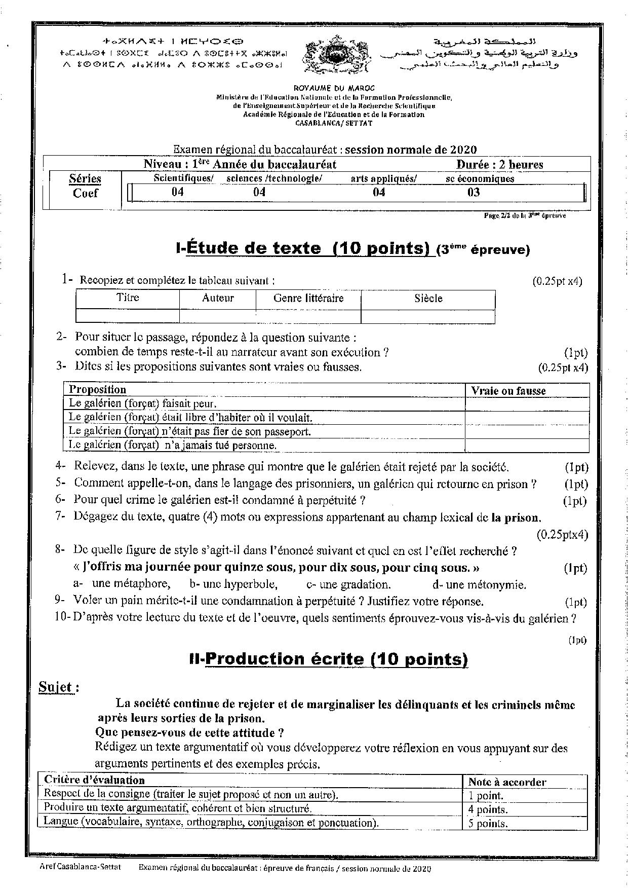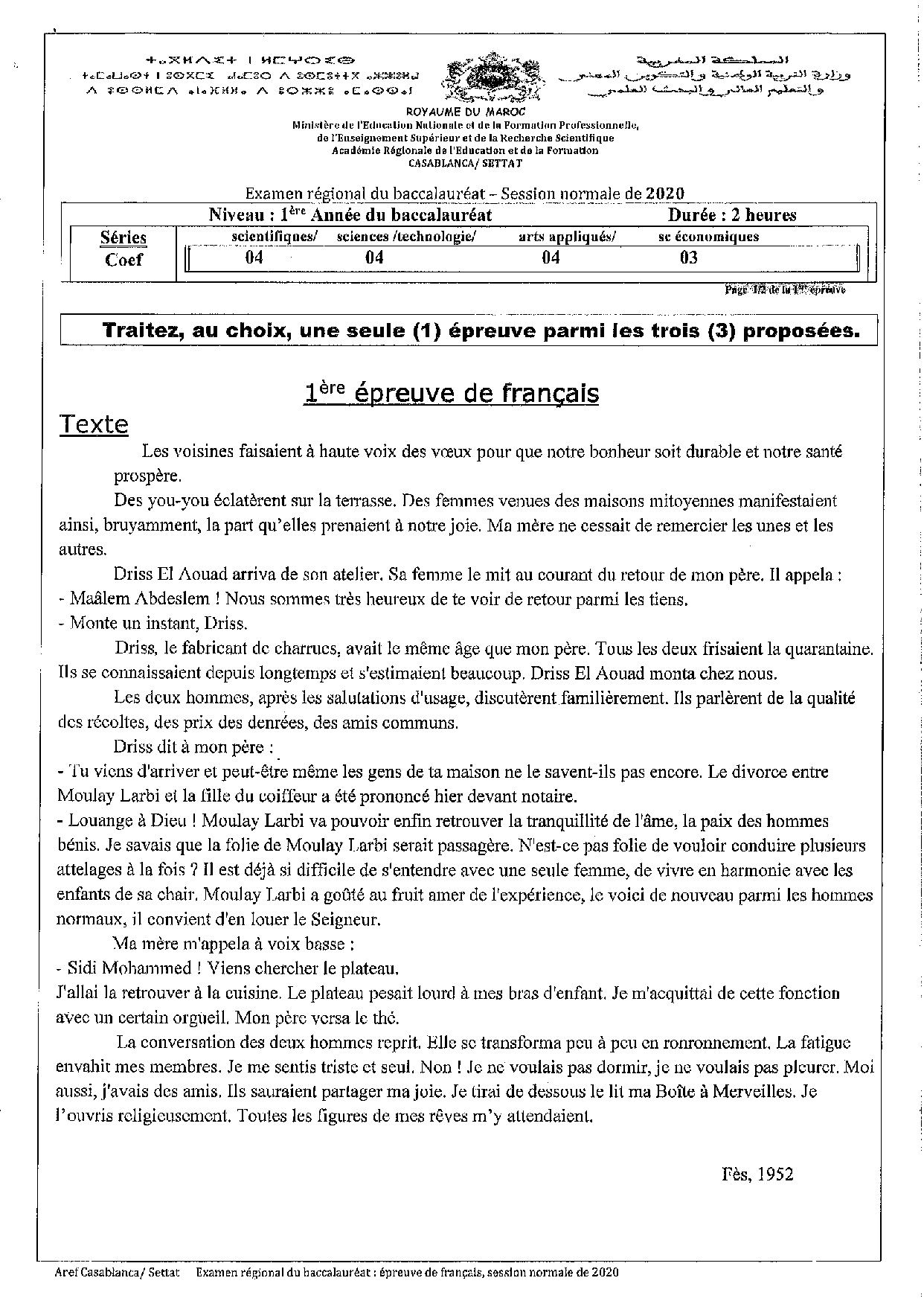 Examen régional Français (Session Normale) - Casablanca-Settat 2020 - Sujet