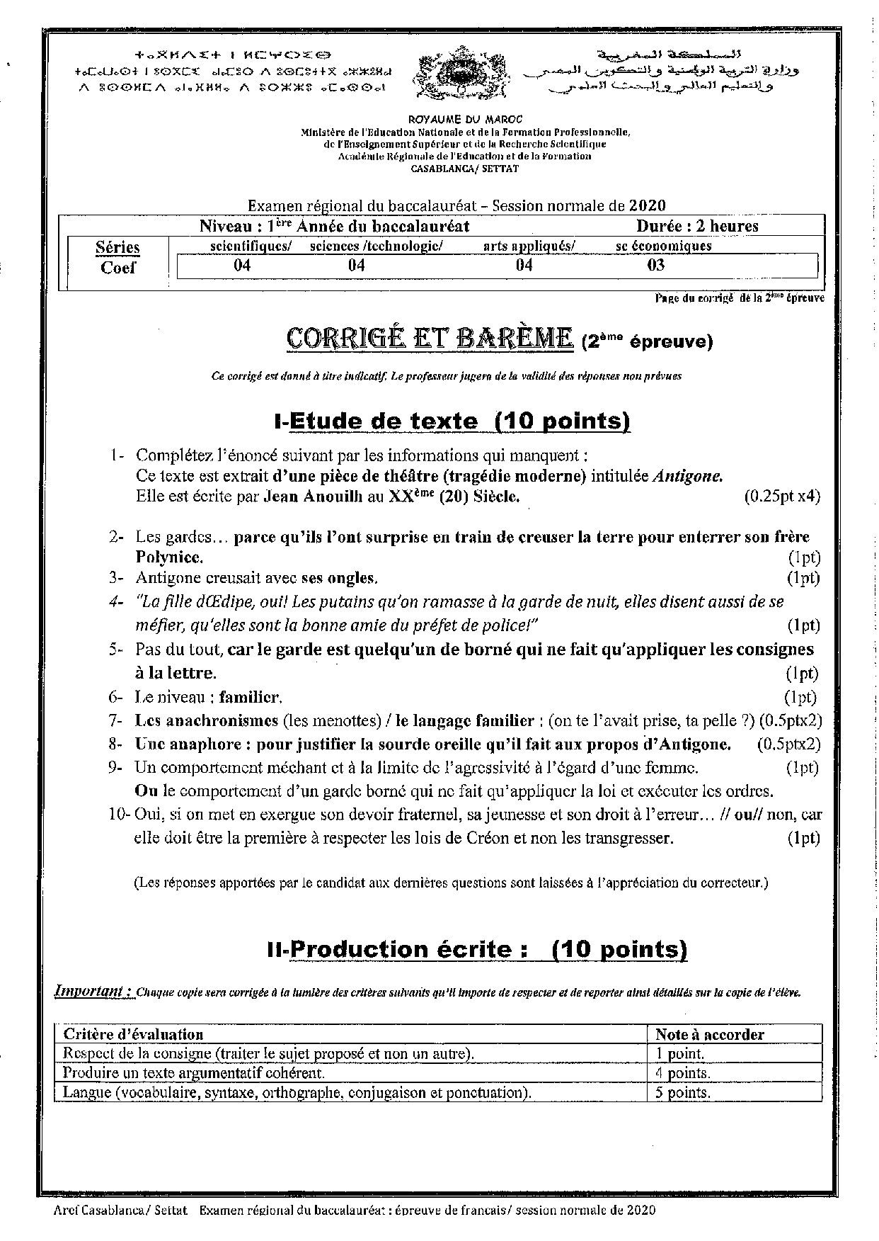 Examen régional Français (Session Normale) - Casablanca-Settat 2020 - Corrigé