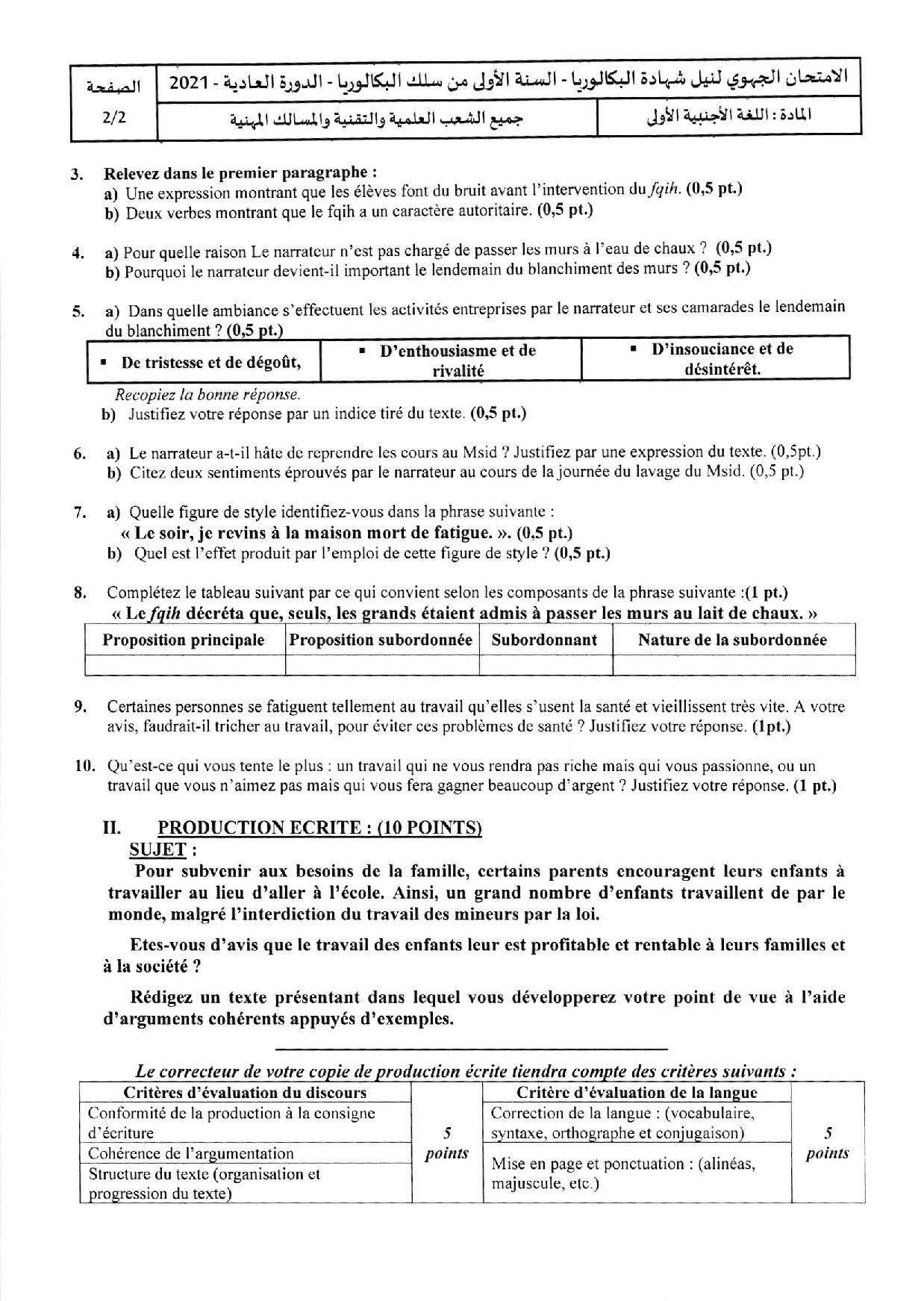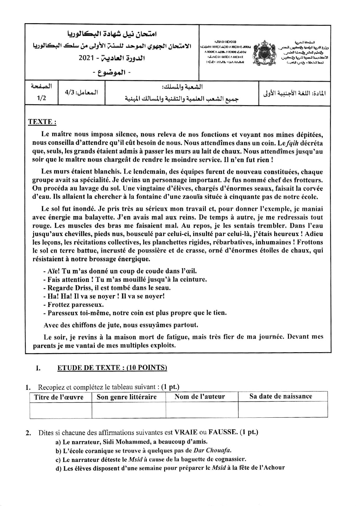 Examen régional Français (Session Normale) - Dakhla-Oued Ed-Dahab 2021 - Sujet