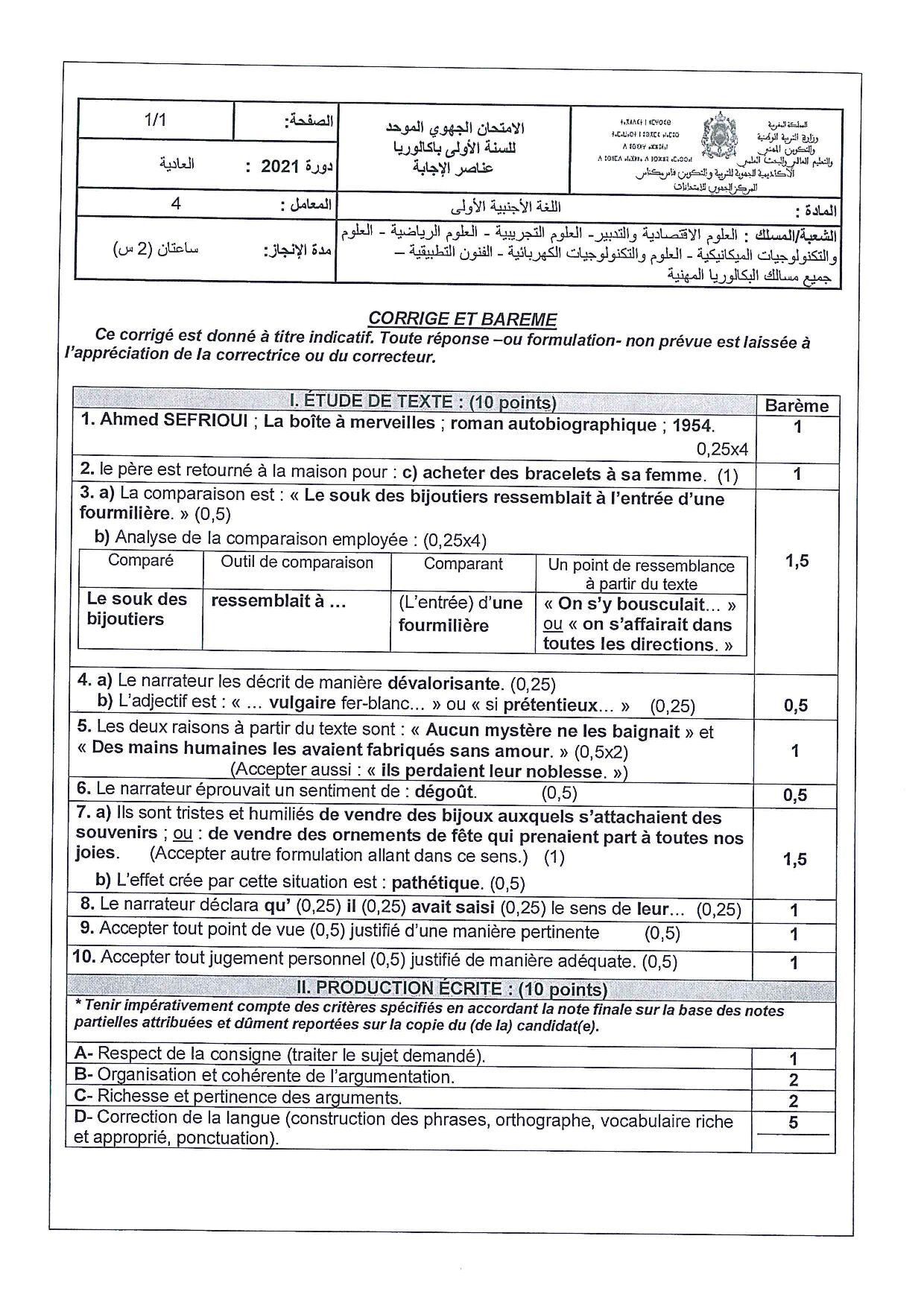 Examen régional Français (Session Normale) - Fès-Meknès 2021 - Corrigé