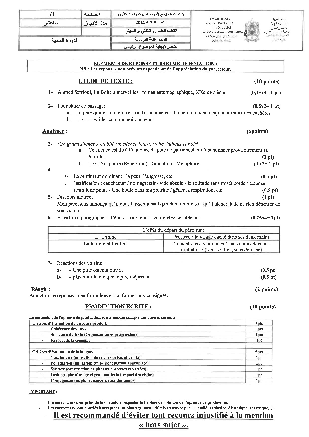 Examen régional Français (Session Normale) - Rabat-Salé-Kénitra 2021 - Corrigé