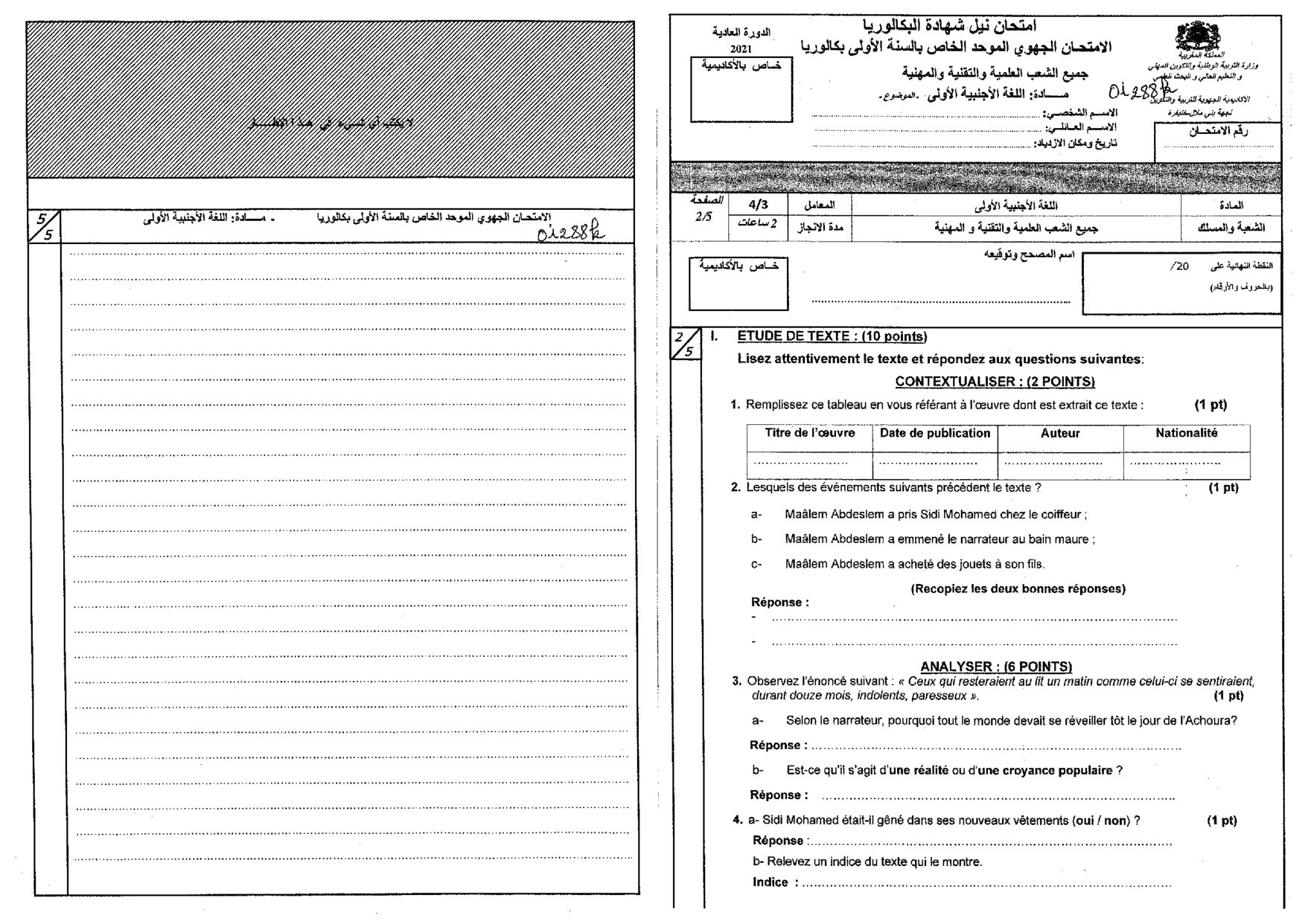 Examen régional Français (Session Normale) - Béni Mellal-Khénifra 2021 - Sujet