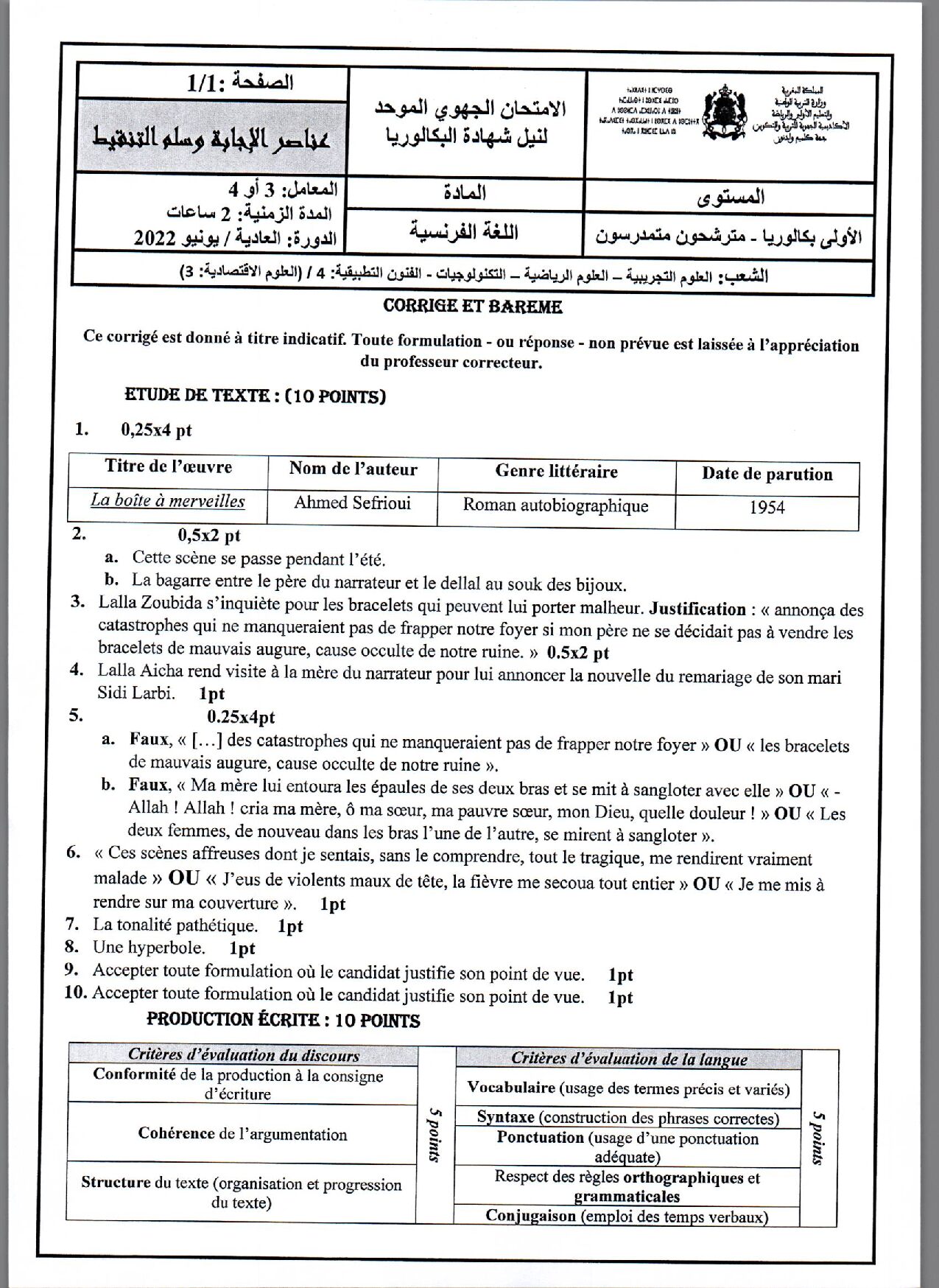 Examen régional Français (Session Normale) - Guelmim-Oued Noun 2022 - Corrigé