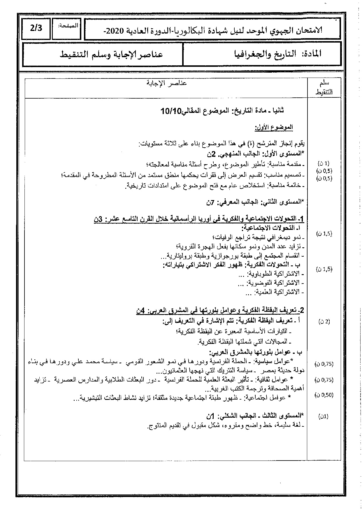 الامتحان الجهوي في التاريخ والجغرافيا (د. العادية) - الدار البيضاء سطات 2020 - التصحيح
