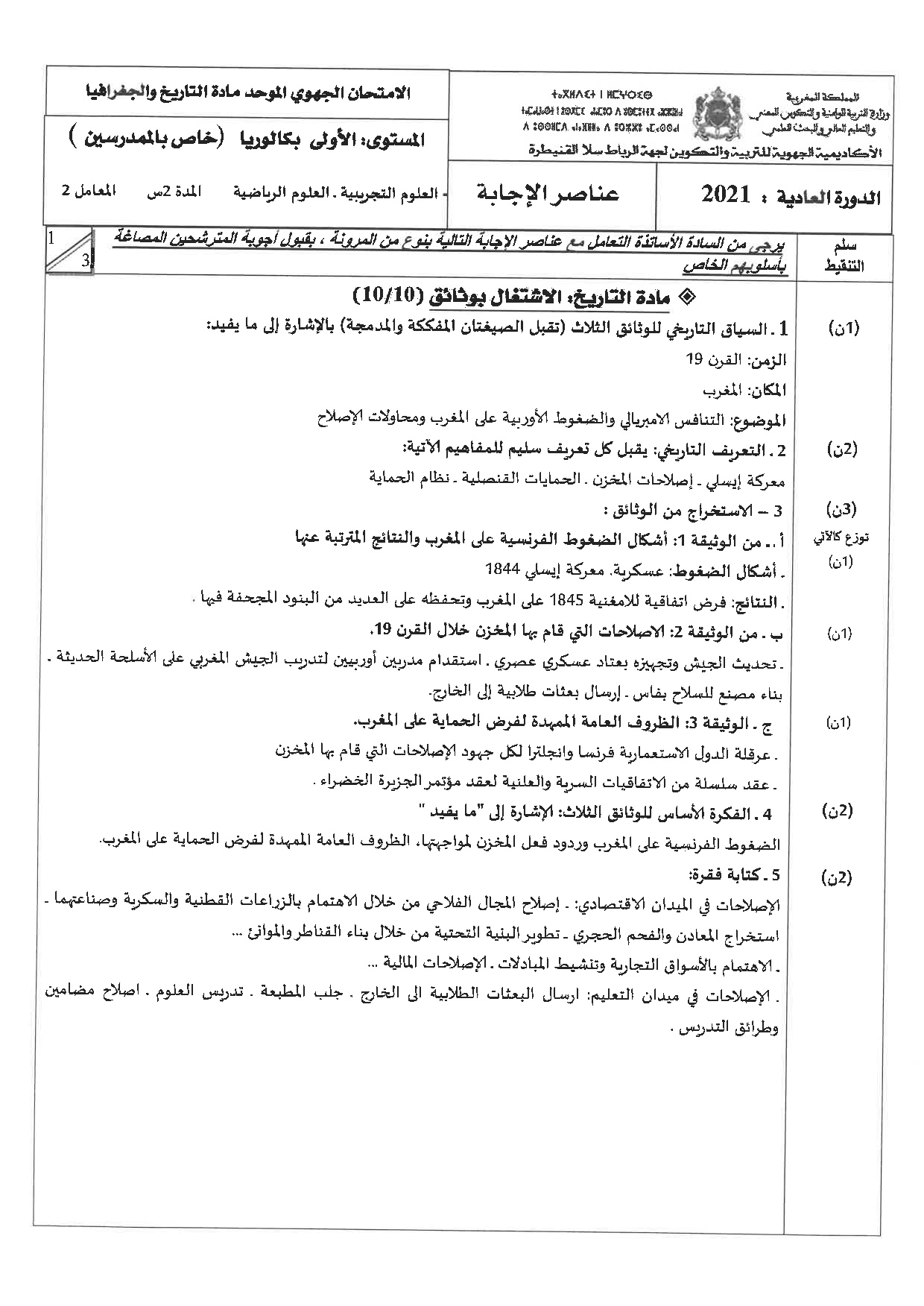 الامتحان الجهوي في التاريخ والجغرافيا (د. العادية) - الرباط سلا القنيطرة 2021 - التصحيح