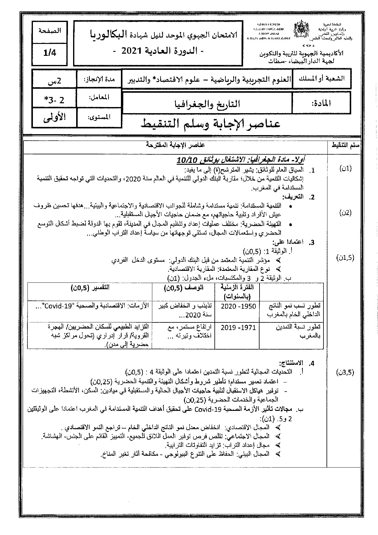 الامتحان الجهوي في التاريخ والجغرافيا (د. العادية) - الدار البيضاء سطات 2021 - التصحيح