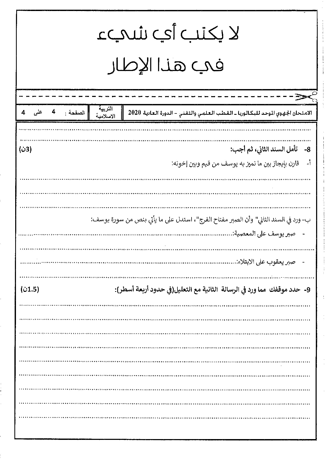 الامتحان الجهوي في التربية الإسلامية (د. العادية) - الدار البيضاء سطات 2020 - الموضوع