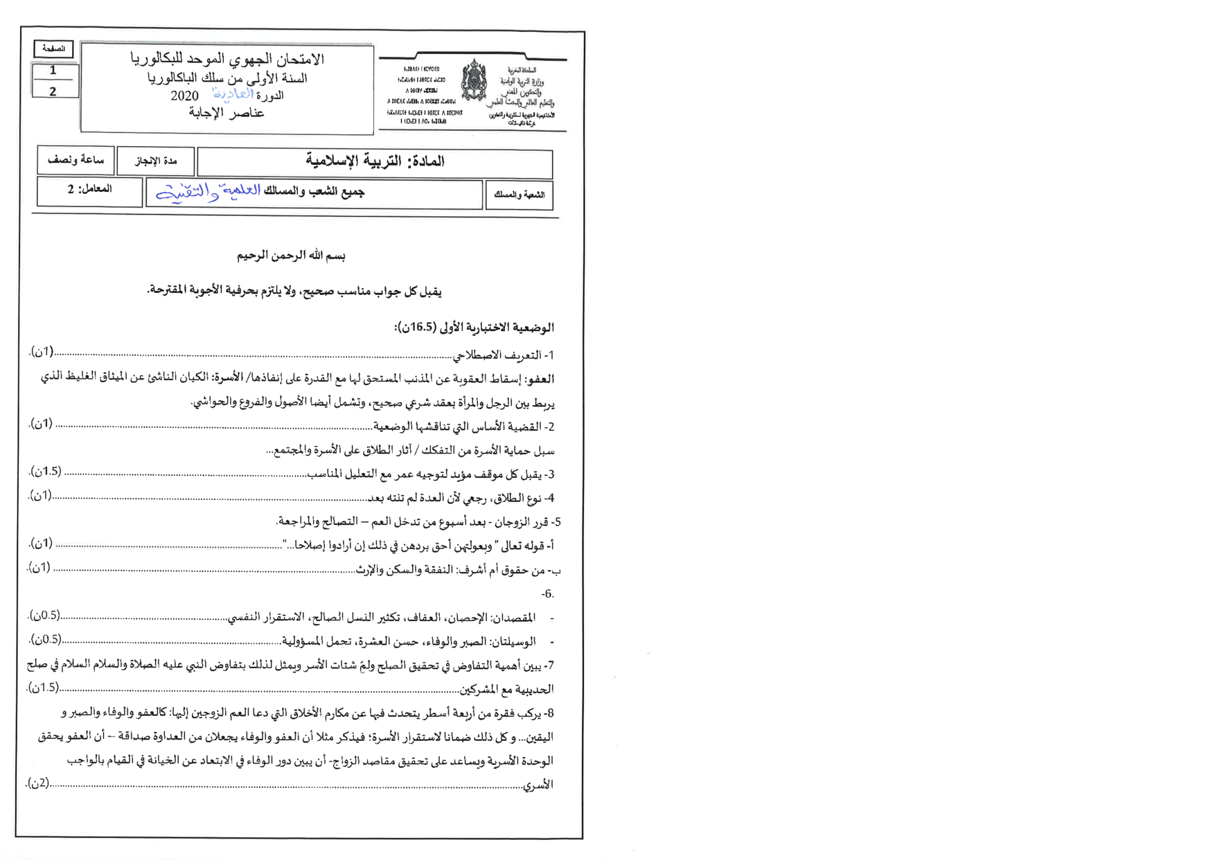 الامتحان الجهوي في التربية الإسلامية (د. العادية) - درعة تافيلالت 2020 - التصحيح