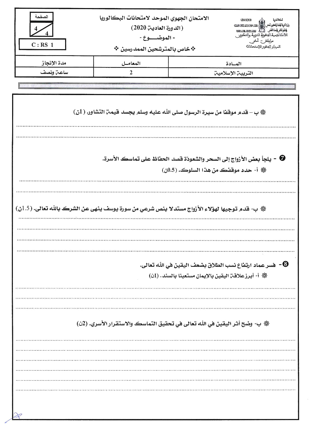الامتحان الجهوي في التربية الإسلامية (د. العادية) - مراكش آسفي 2020 - الموضوع