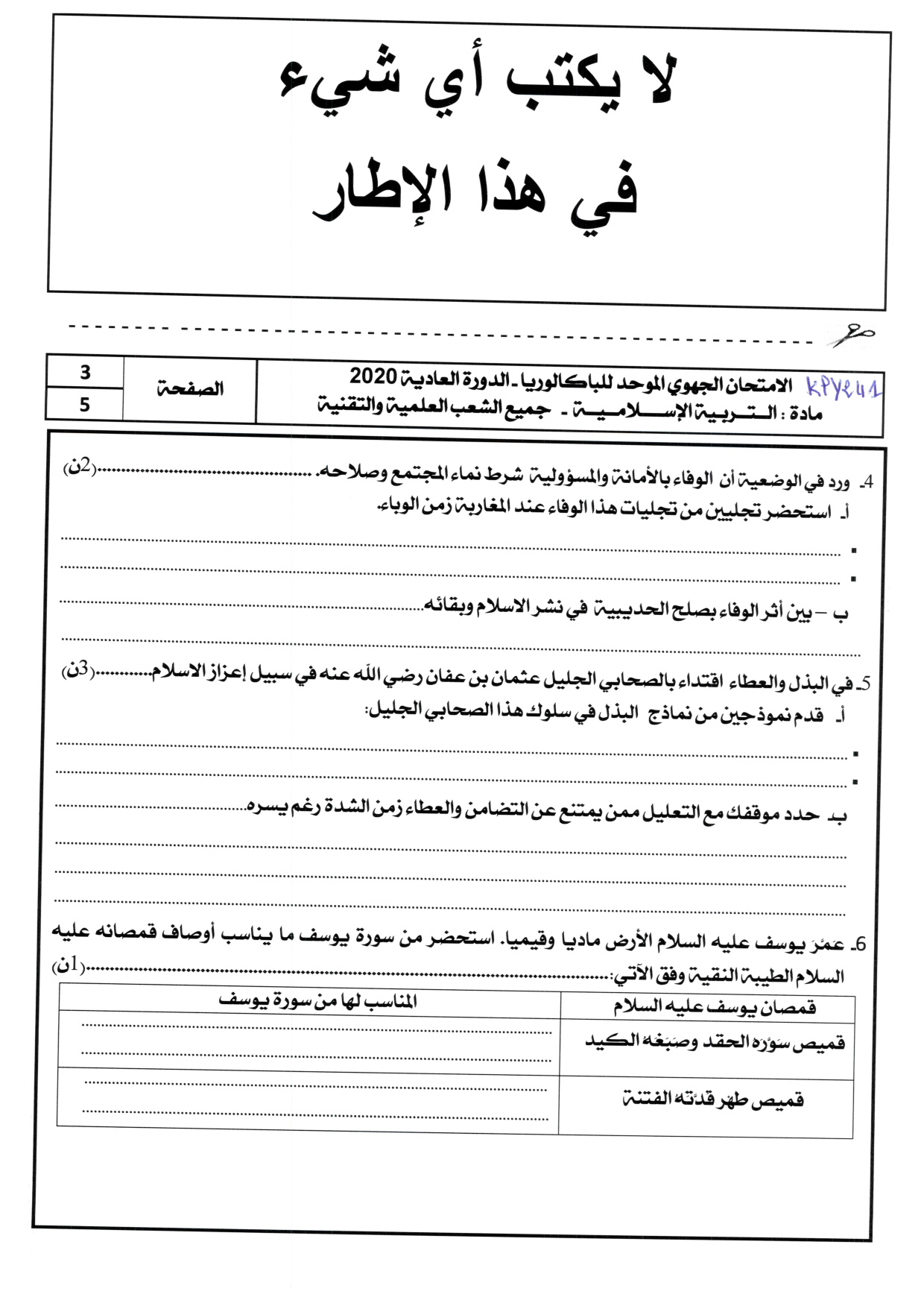 الامتحان الجهوي في التربية الإسلامية (د. العادية) - بني ملال خنيفرة 2020 - الموضوع