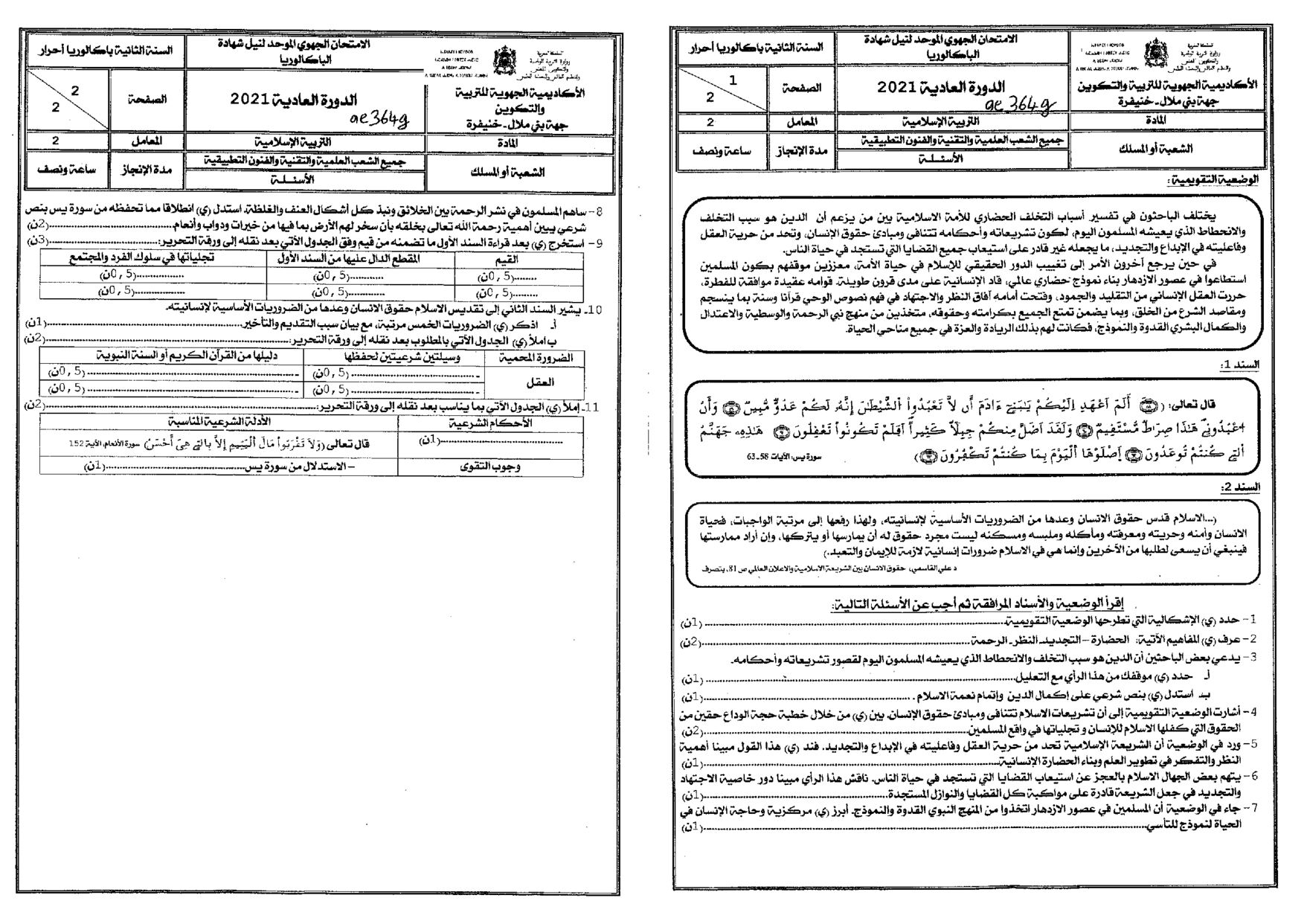 الامتحان الجهوي في التربية الإسلامية (د. العادية) - بني ملال خنيفرة 2021 - الموضوع